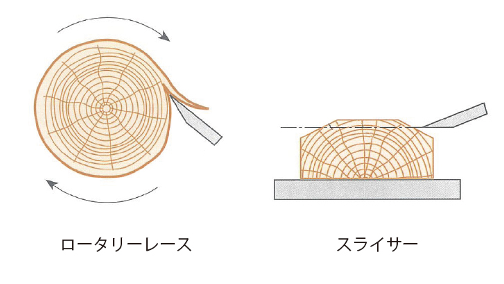 ロータリーレースという機械で丸太を板状にする方法があります。丸太の両端の円の中心に回転軸を押し当てて挟み、回転させます。そこに長い刃を押し当てながら、大根のカツラムキの様に幅広い板を突き出します。これで得られた厚さ2mm程度の板を複数枚貼り合わせたものが「合板」(ゴウハン)と呼ばれる90cm x 180cmなど大きさが規格化された板です。